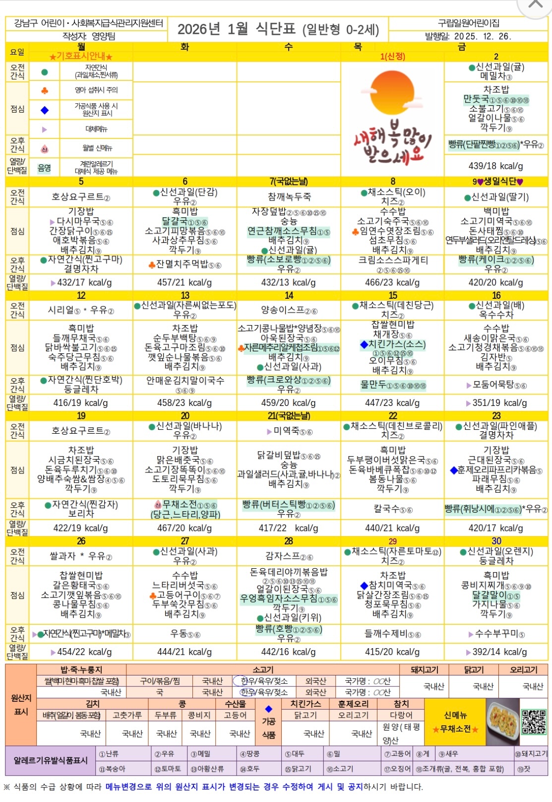 26년 1월 유아식단표