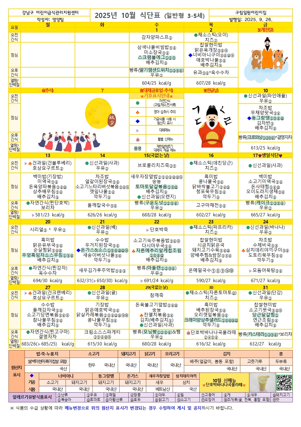 9월 유아식단표